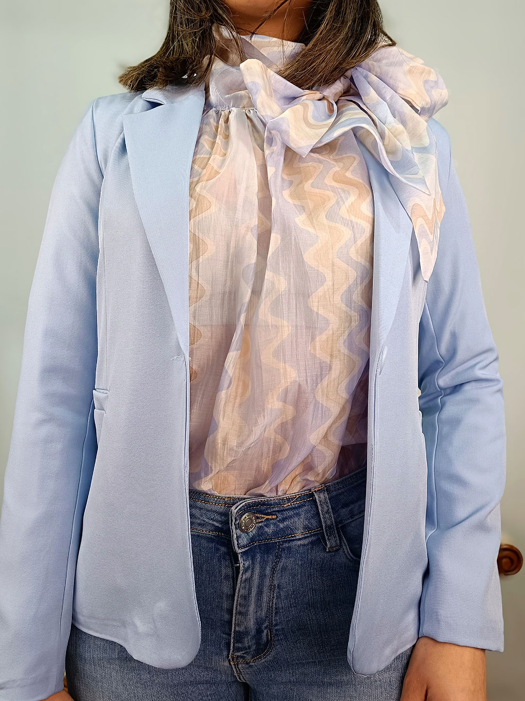 Gracias a su patrón estructurado, la americana sastre azul cielo define los hombros y entalla la cintura, creando una silueta esbelta y profesional.