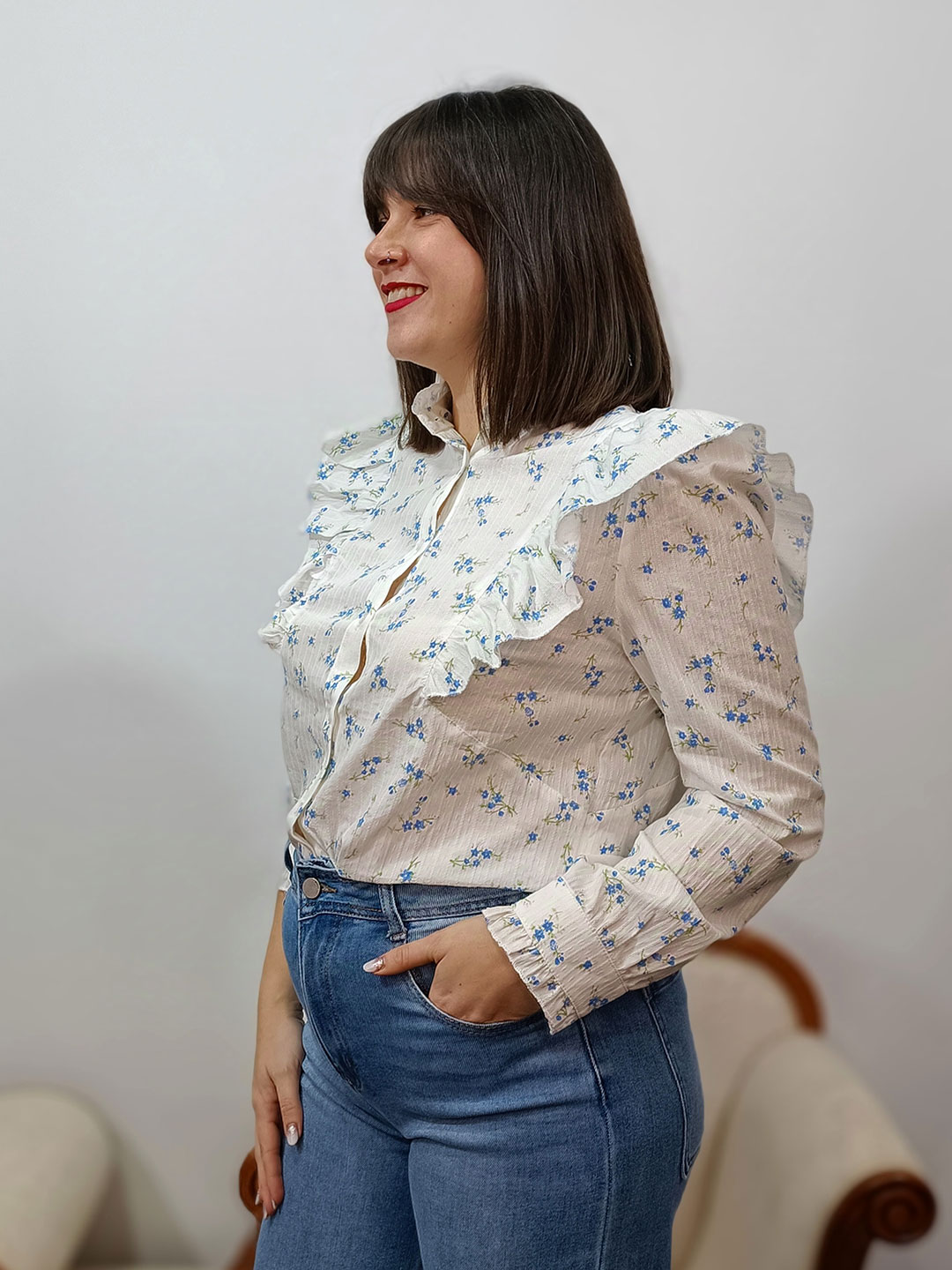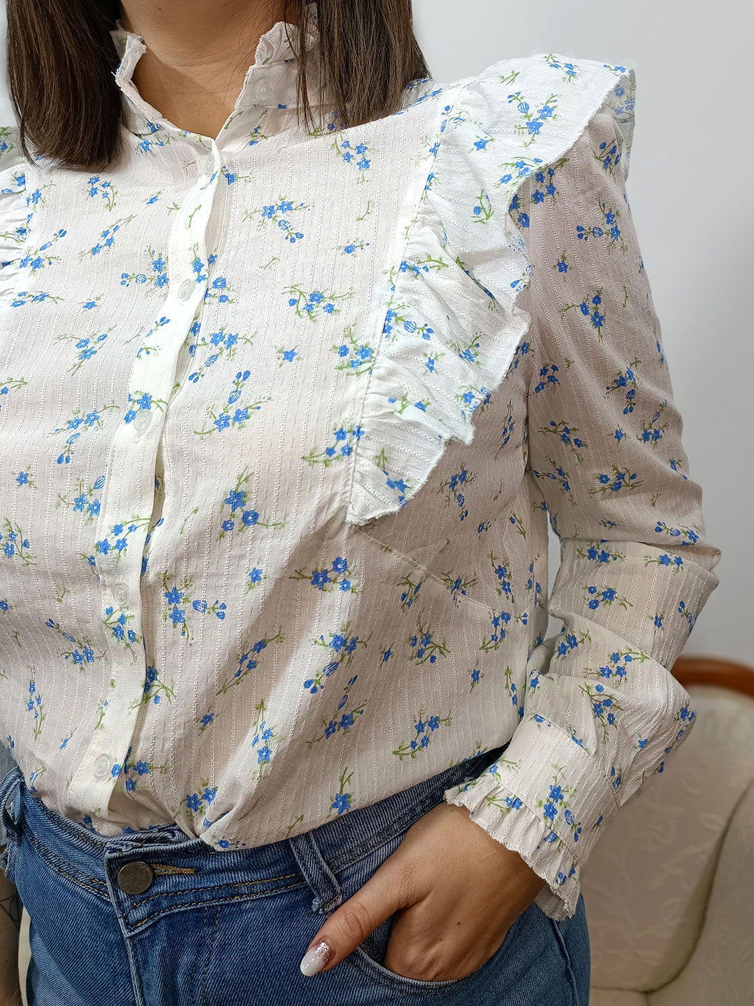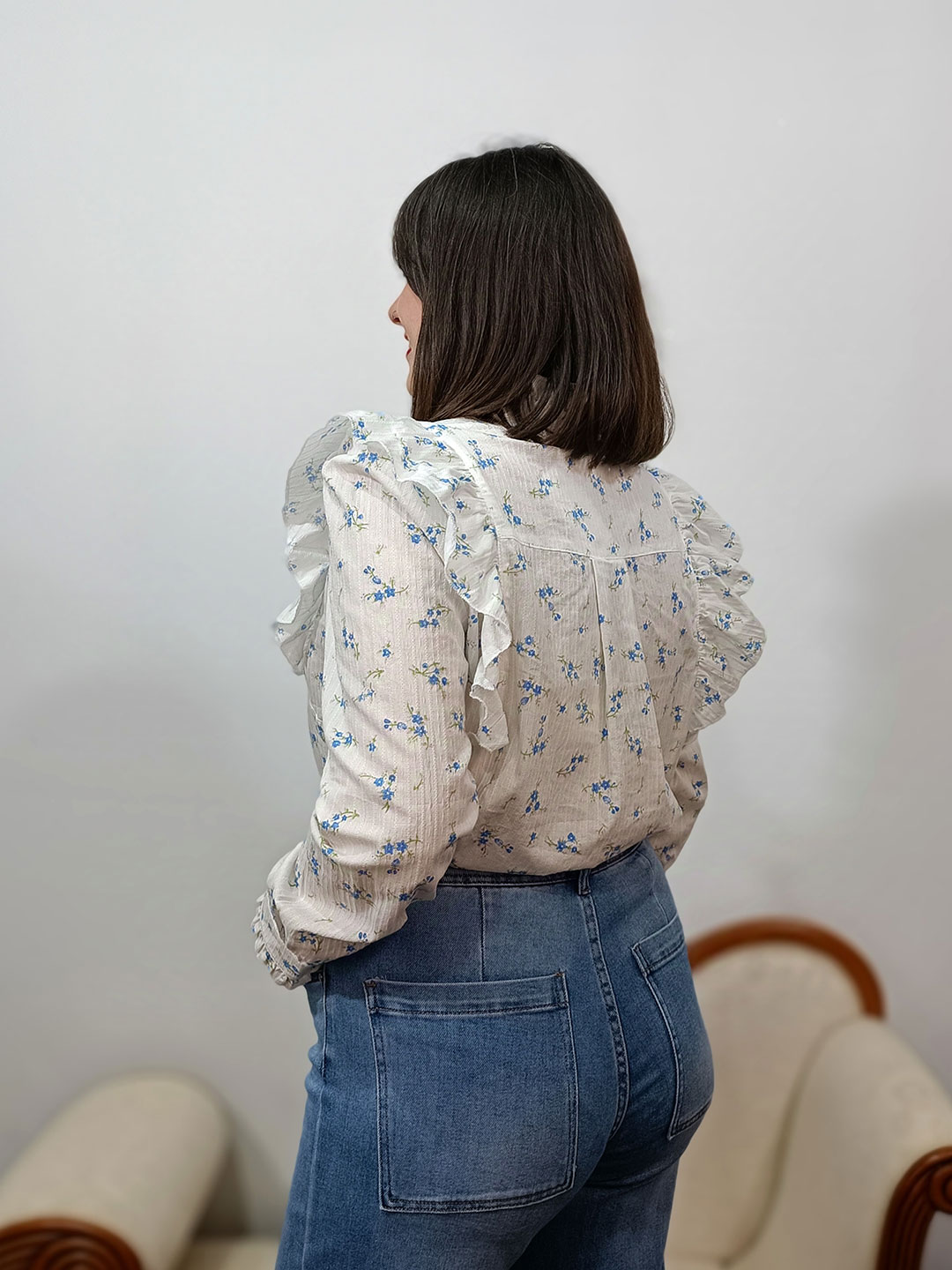 Blusa flor liberty con el fondo en blanco y estampado en tonos azules y verde. Con cuello medio y sisa con volantes. Ajuste regular. Tallas S/M y M/L.