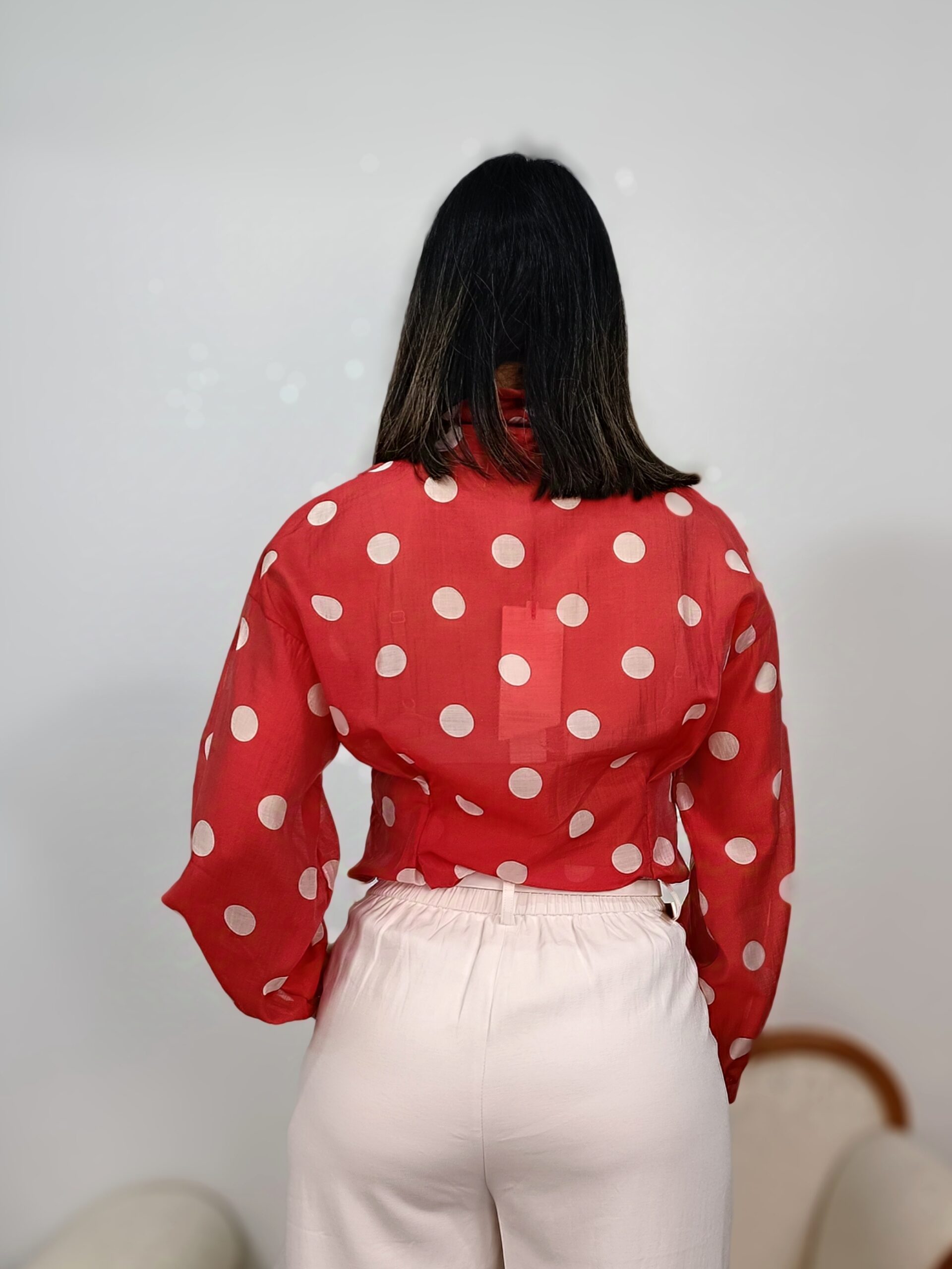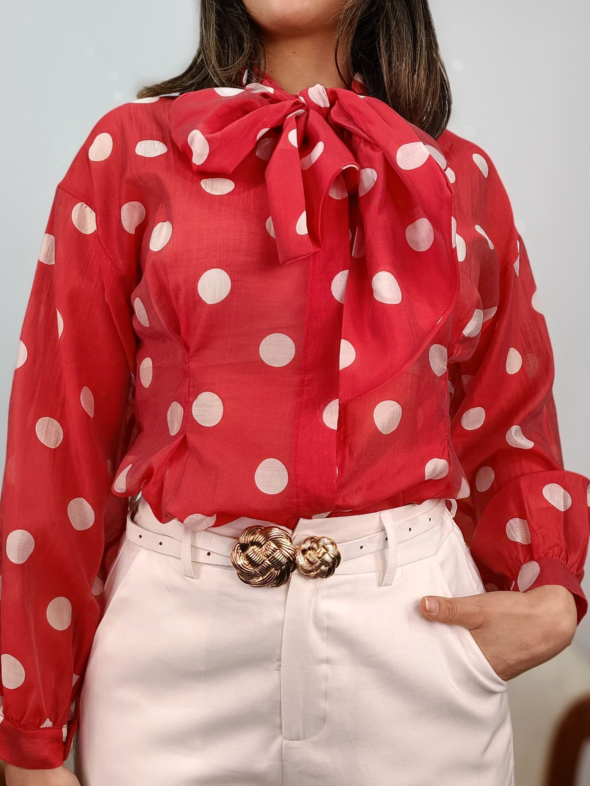 Blusa roja lunares blancos lazada al cuello
