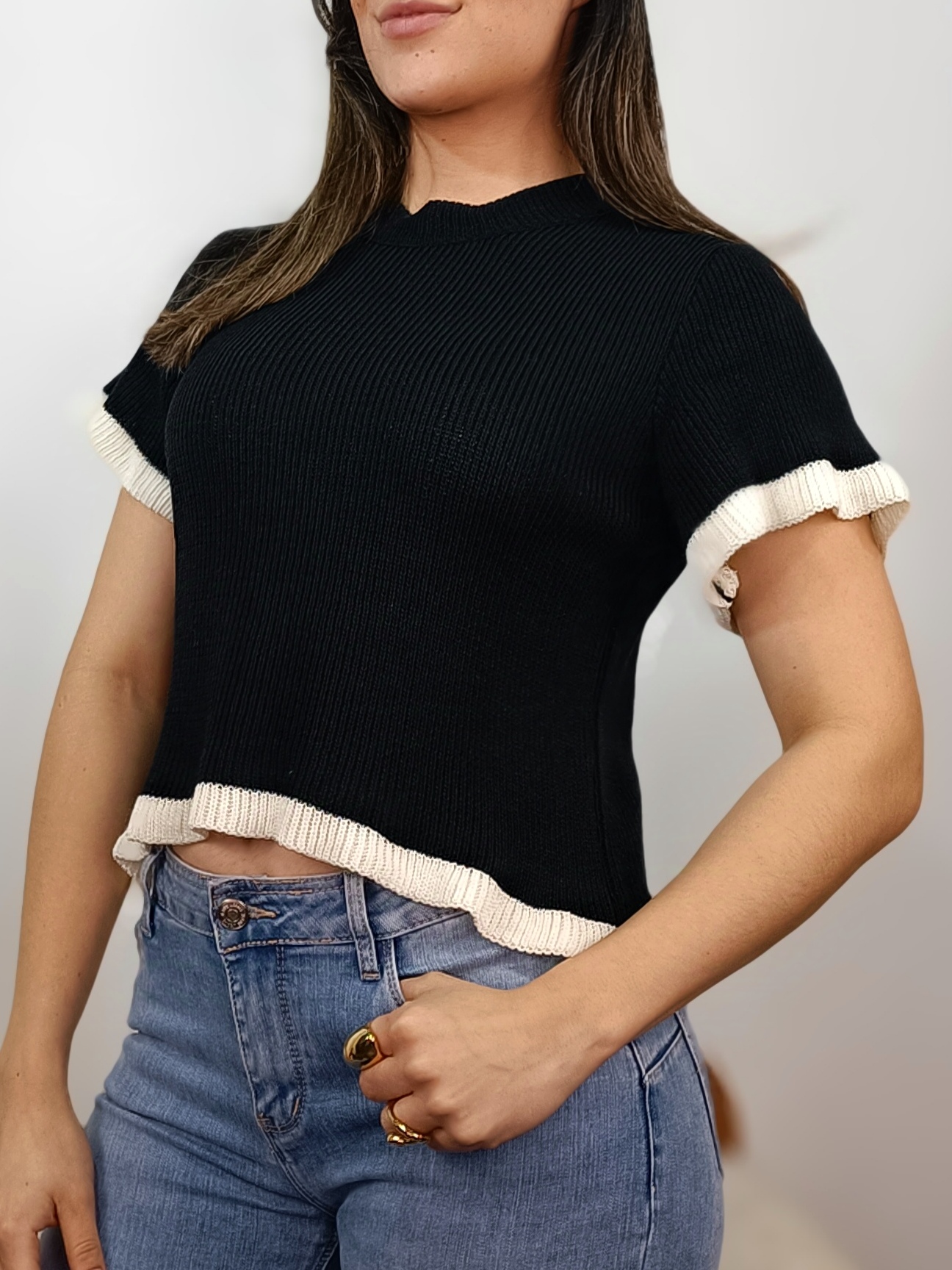 Para un look impecable en la Vall d’Uixó, combina tu jersey de punto negro  con unos pantalones vaqueros de tiro alto y unas sandalias cómodas. Si buscas algo más formal, llévalo por dentro de una falda midi blanca para potenciar el contraste de los ribetes. Este jersey de punto negro  es esa prenda «vitamina» que te hará sentir radiante en cualquier ocasión.