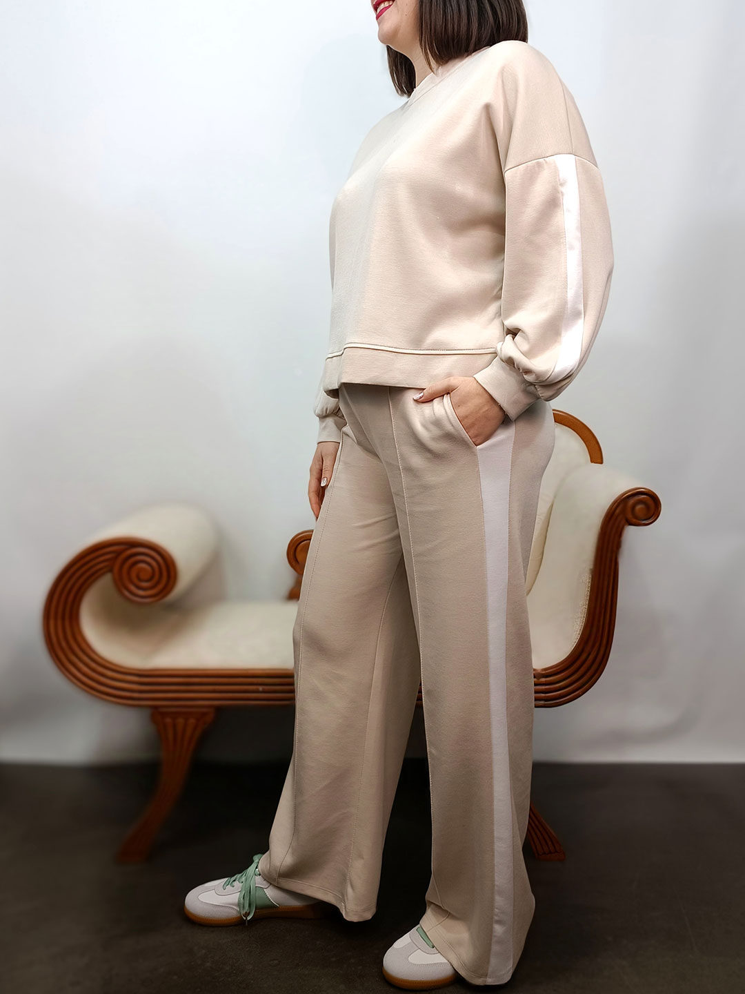Chándal beige banda lateral, con el pantalón fluido con goma fruncida en cintura. La sudadera con cuello caja de ajuste regular. Lleva bandas en beige tanto el pantalón como la parte de arriba. No lleva felpa en el interior. Talla única que cubre M-L.