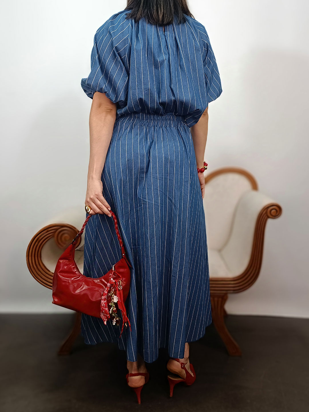 Sin duda, la mayor ventaja de este conjunto midi de dos piezas azul denim rayas blancas es su capacidad de transformación. Por ejemplo, puedes combinar la falda con una camisa blanca básica para un estilo más working, o usar el top con tus vaqueros favoritos para un toque chic diario. No obstante, el total look con accesorios en rojo o dorado sigue siendo la opción más impactante para una invitada perfecta. Debido a su diseño atemporal, es una inversión que no pasa de moda. En conclusión, este conjunto representa la inteligencia en el vestir: elegancia coordinada y funcionalidad por separado en una sola compra.
