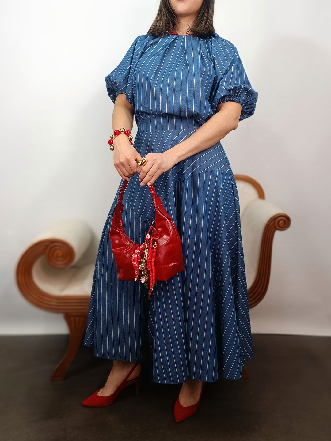 La parte superior del conjunto midi de dos piezas azul denim rayas blancas destaca por su volumen y feminidad. En primer lugar, el top presenta un cuello caja y unas mangas abullonadas con puño elástico que crean una silueta romántica muy favorecedora. Asimismo, la falda midi de corte evasé nace de una cintura ancha que entalla la figura, abriéndose en un vuelo espectacular gracias a su patrón en piezas diagonales. Por otra parte, la calidad del tejido asegura que el volumen se mantenga definido en todo momento. Por lo tanto, el conjunto garantiza una imagen impecable y arquitectónica.
