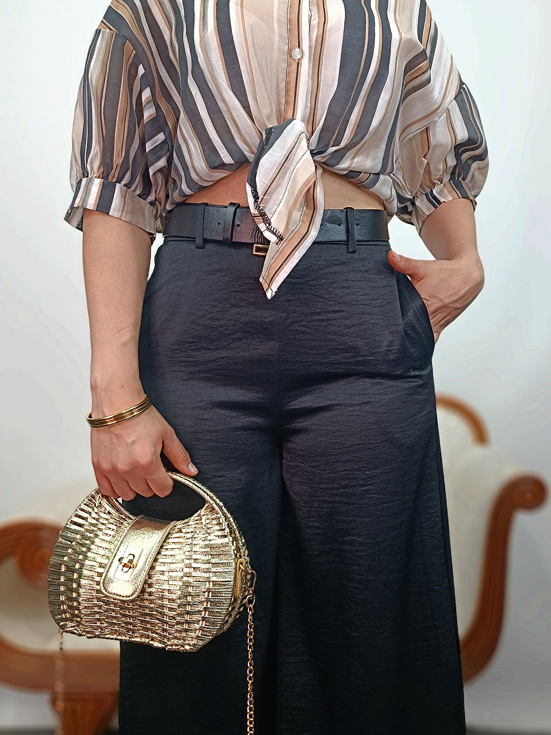 Sin duda, el pantalón fluido negro de talle alto ofrece infinitas posibilidades de combinación. Por ejemplo, para un estilo más dinámico y moderno, puedes coordinarlo con una blusa de rayas anudada y un cinturón de piel negro que acentúe la silueta. No obstante, si buscas un look de noche deslumbrante, añadir un bolso joya dorado y unos tacones finos será un acierto seguro. Debido a su corte atemporal, esta prenda se convierte en una inversión duradera para tu fondo de armario. En conclusión, este pantalón es mucho más que una prenda básica; es el secreto para lucir siempre sofisticada y segura de ti misma.