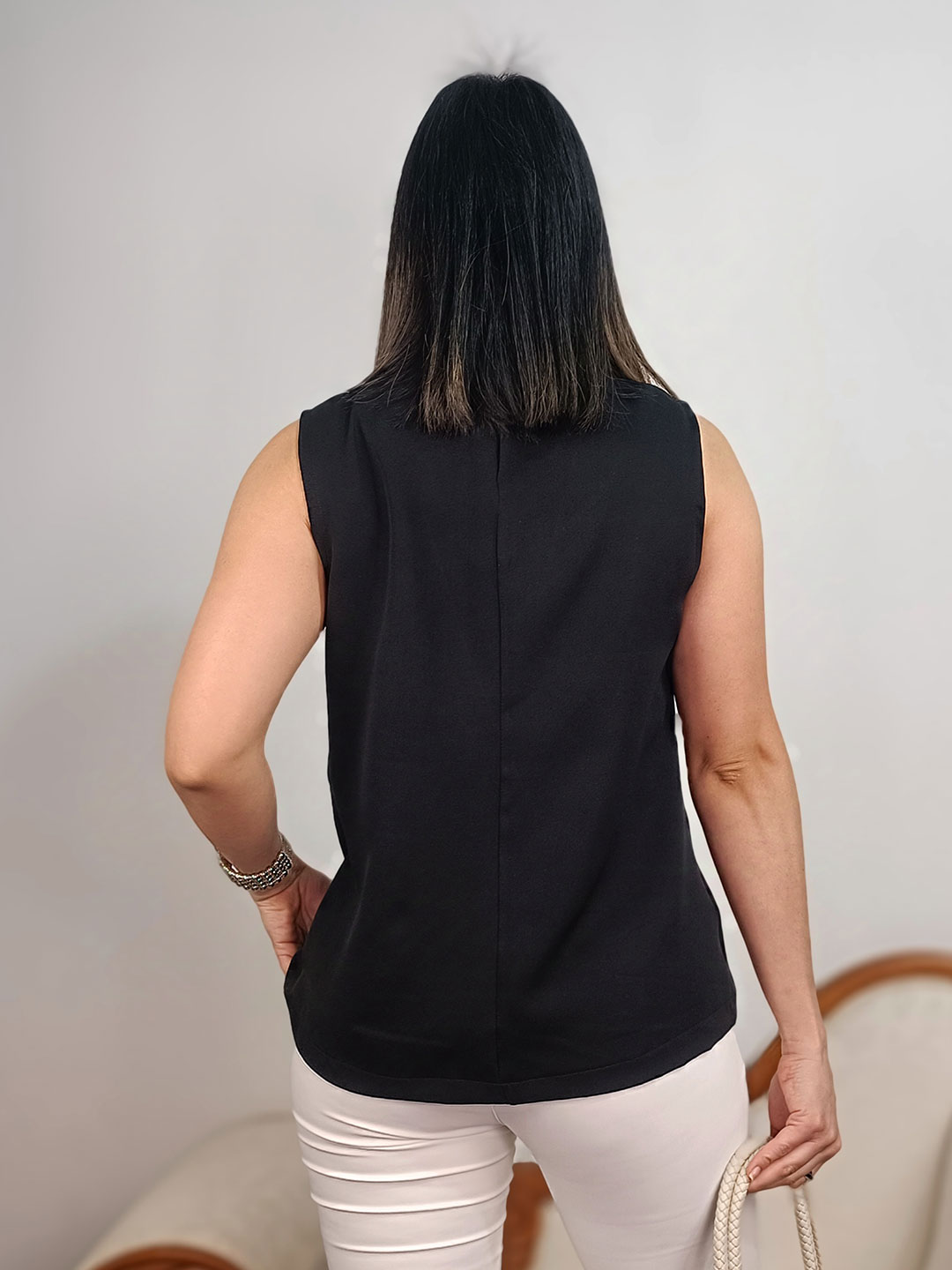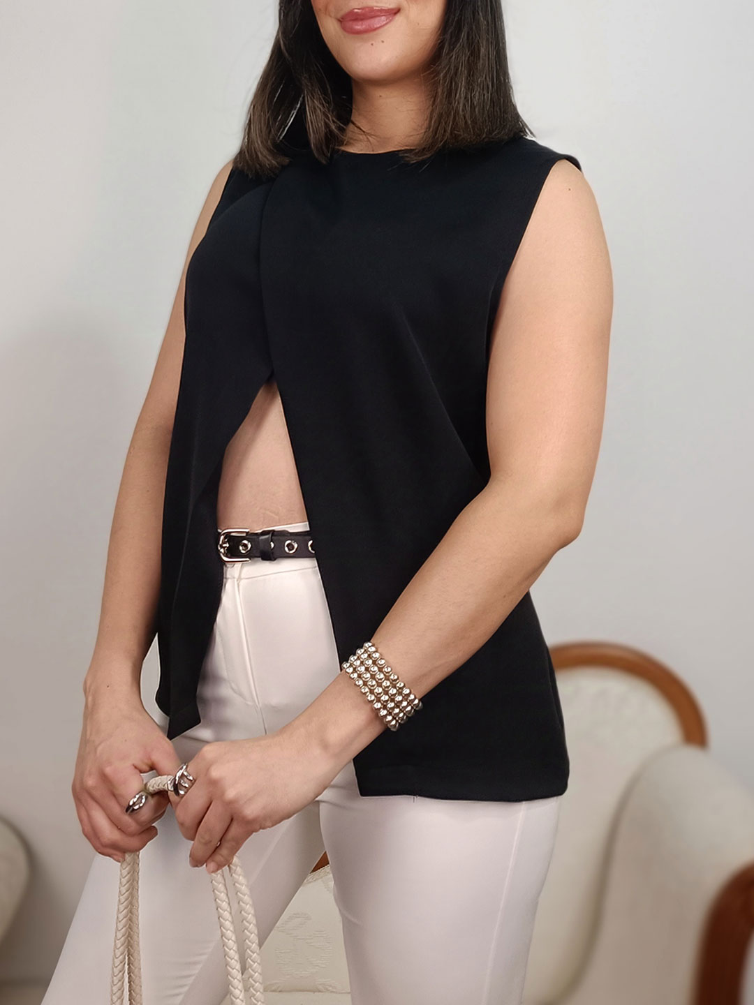 Sofisticado top negro sin mangas con diseño cruzado frontal. Una prenda de silueta moderna y estructurada con cuello caja, ideal para combinar con pantalones de talle alto y crear un look de impacto. Talla unica que cubre S-M-L.